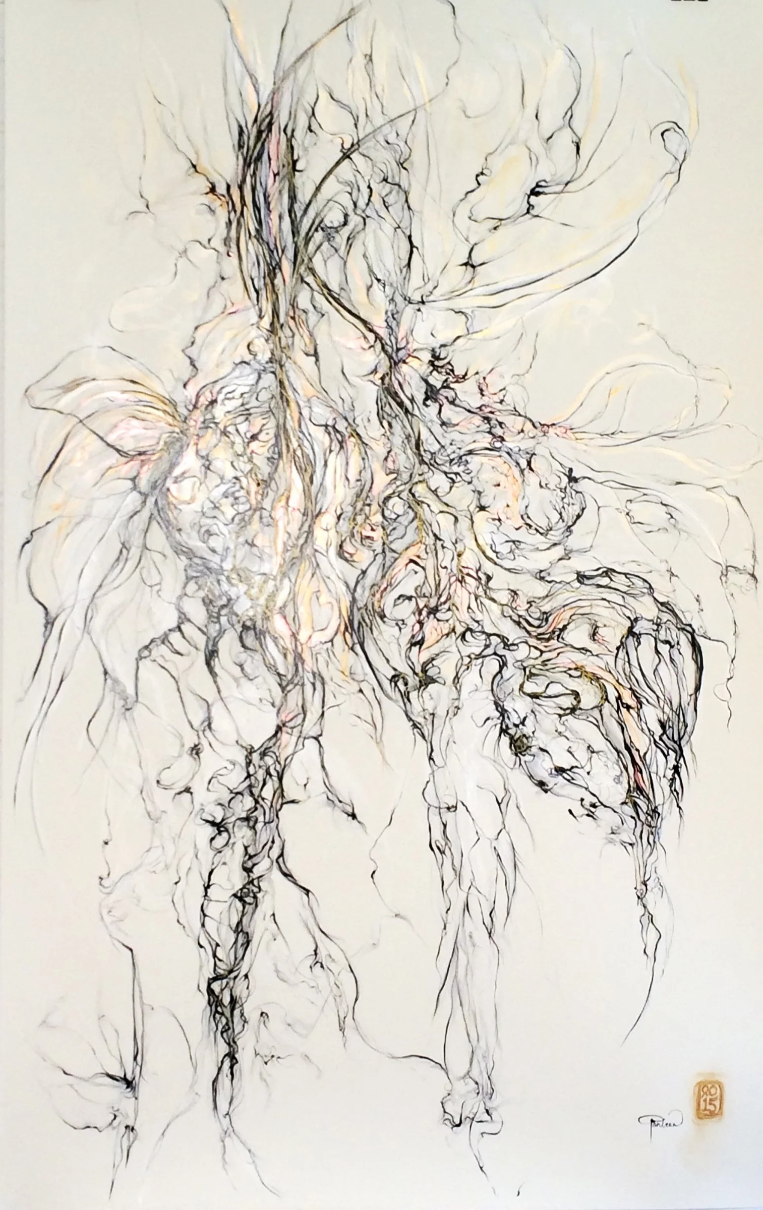 Through fine line brushwork and a deeply intuitive process, I create works that balance fragility with force. Inspired by imagined landscapes & natural elements, where stillness and movement coexist.